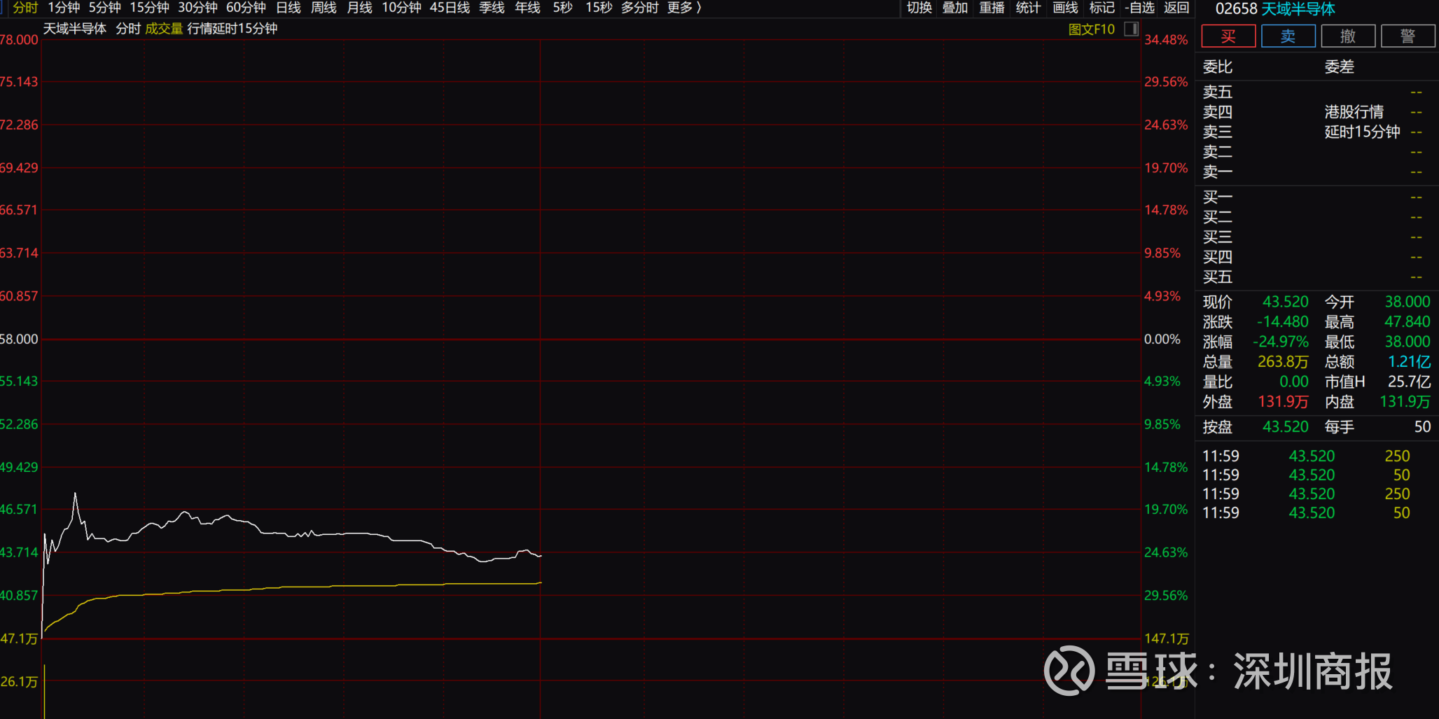 天域半导体(2658.HK)今日在港交所上市,开盘价为38港元,较58港元发行价下跌34%,上市首日即破发。以每手50股计算,天域半导体一手账面将亏损1000港元。截至中午收盘,公司股价跌幅有所收窄,跌24%,报43.520港元/股,市值172.62亿港元。