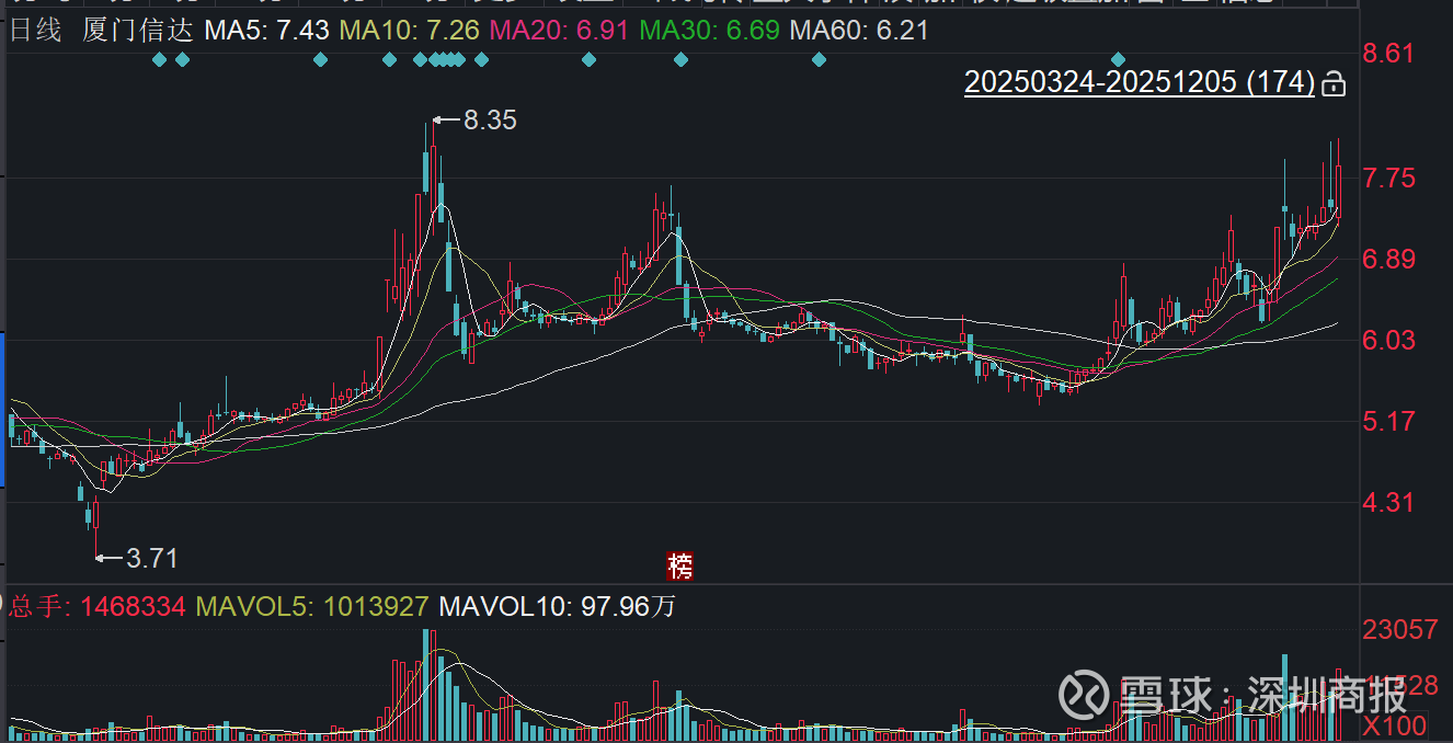 二级市场上,截至12月5日收盘,厦门信达上涨5.93%报7.86元/股,盘中涨停后回落,总市值约53.12亿元,今年来公司股价累计上涨超七成。