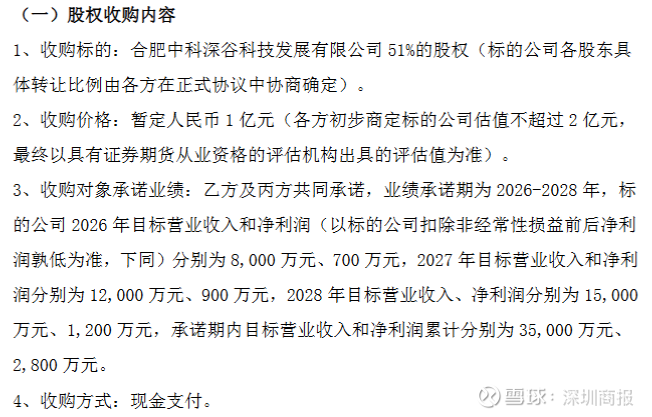根据协议,中科深谷承诺2026年营业收入8000万元、净利润700万元;2027年营业收入1.2亿元、净利润900万元;2028年营业收入1.5亿元、净利润1200万元,三年累计承诺营业收入3.5亿元、净利润2800万元。业绩未达标时,转让方需用保证金补偿。