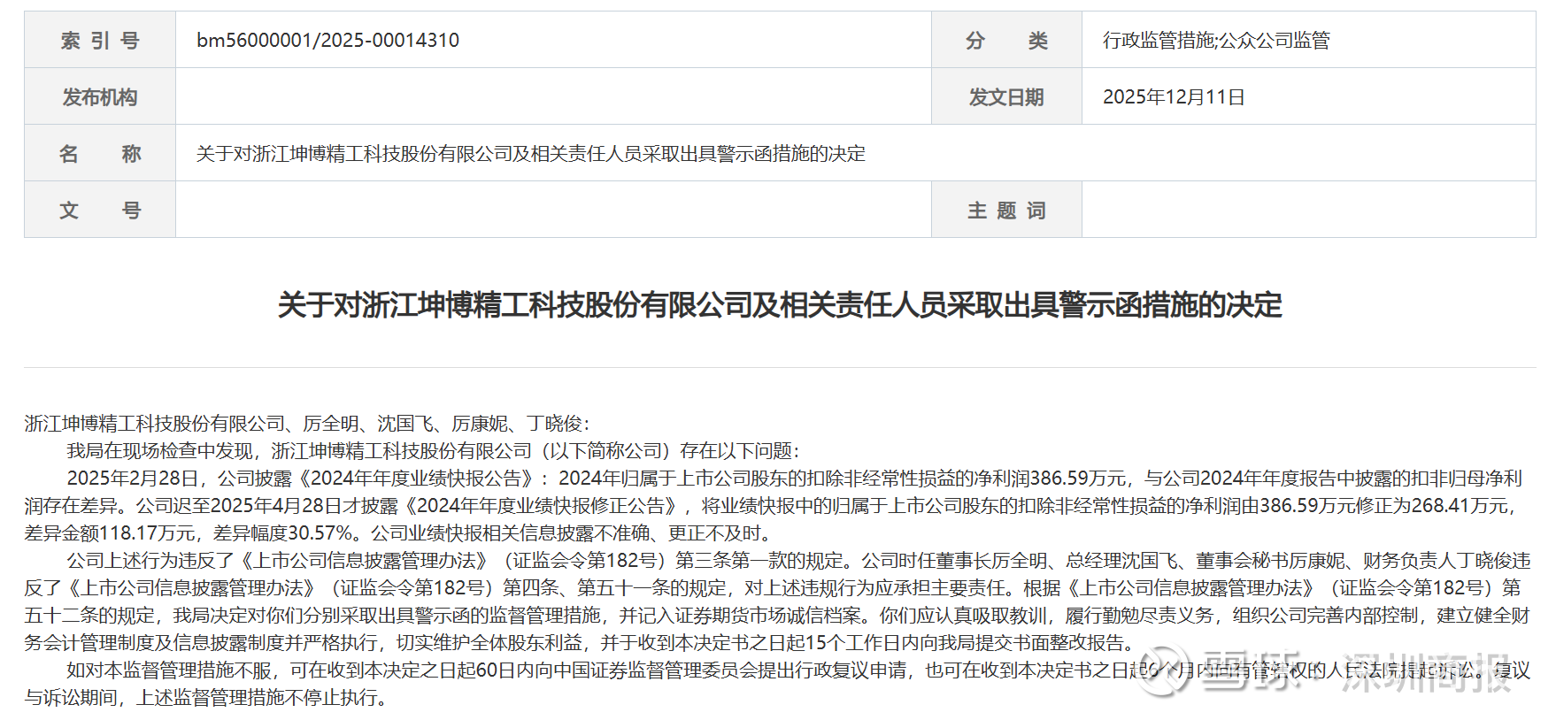 12月11日,浙江证监局官网发布的行政监管措施显示,坤博精工(920570)及相关责任人员被出具警示函。