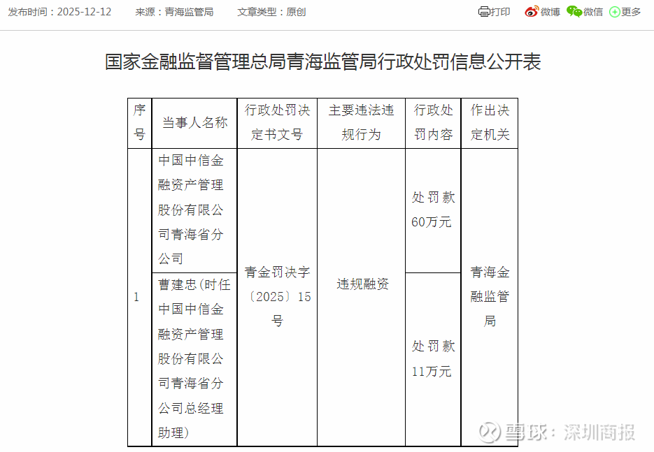 行政处罚信息公开表显示,因违规融资,中信金融资产青海省分公司被处以罚款60万元,曹建忠被处以罚款11万元。