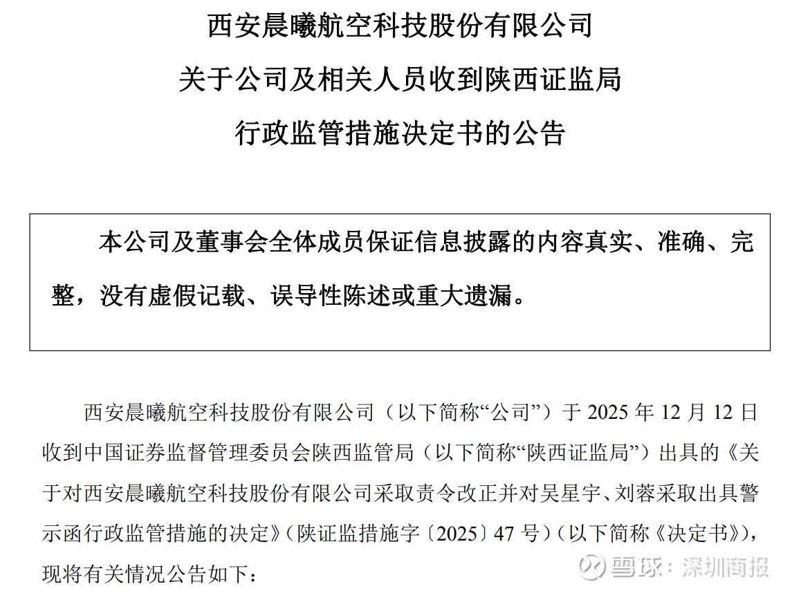 晨曦航空(300581)12月12日晚间公告,公司当天收到陕西证监局出具的《关于对西安晨曦航空科技股份有限公司采取责令改正并对吴星宇、刘蓉采取出具警示函行政监管措施的决定》。