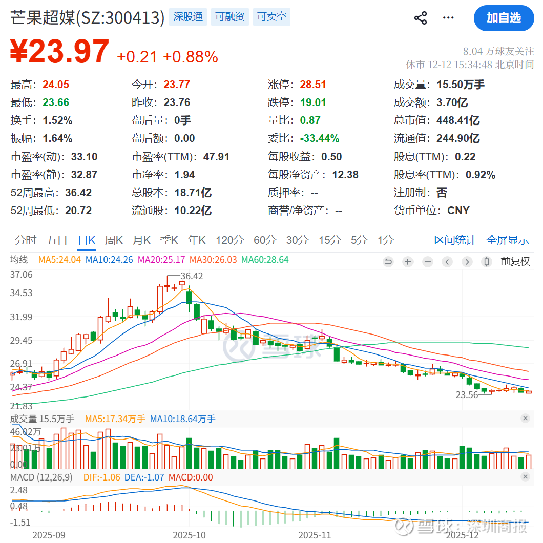 二级市场上,截至12月12日收盘,芒果超媒上涨0.88%报28.97元/股,总市值约448.41亿元,今年来公司股价累计下跌9.93%。
