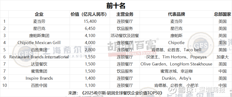12月15日,《胡润全球餐饮企业价值TOP50》榜单正式发布,该榜单按照企业市值或估值进行排名。这是胡润研究院第四次发布餐饮行业榜单,同时也是首次发布全球范围的餐饮企业价值榜单。麦当劳成为全球餐饮行业最具价值企业,价值1.54万亿元人民币,同时是价值最高的连锁餐厅企业。中国11家企业上榜,其中2家位居前十,分别是价值1500亿元的蜜雪集团和价值1100亿元的百胜中国。