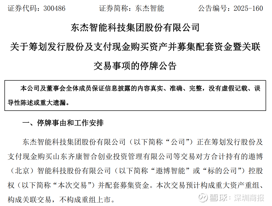 12月16日晚间,东杰智能(300486)公告称,公司正在筹划发行股份及支付现金购买山东齐康智合创业投资管理有限公司等交易对方合计持有的遨博(北京)智能科技股份有限公司(以下简称“遨博智能”)控股权,并配套募集资金。本次交易预计构成重大资产重组、构成关联交易,不构成重组上市。公司股票自2025年12月17日起开始停牌,预计在不超过10个交易日的时间内披露本次交易方案。若公司未能在上述期限内召开董事会审议并披露交易方案,公司股票最晚将于2025年12月31日开市起复牌并终止筹划相关事项。