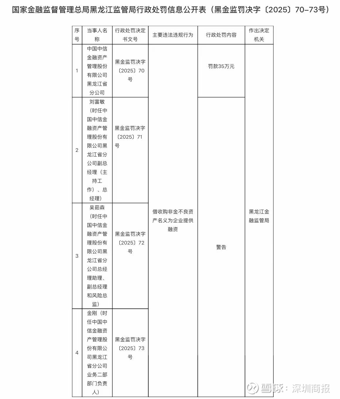 根据国家金融监督管理总局黑龙江监管局在2025年12月19日发布的行政处罚信息,中国中信金融资产管理股份有限公司黑龙江省分公司因借收购非金融不良资产名义为企业提供融资,受到罚款35万元的处罚。