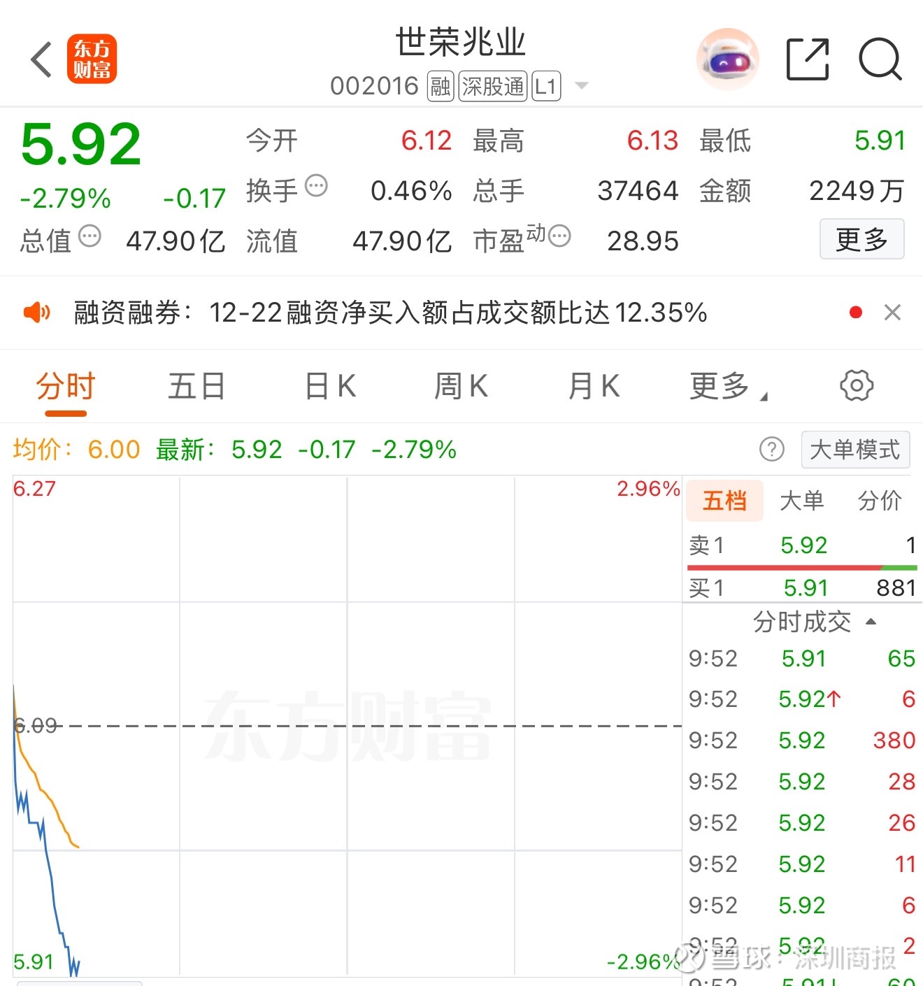 12月23日,世荣兆业(002016)股价开盘跳水,一度跌近3%,截至发稿报5.92元/股。