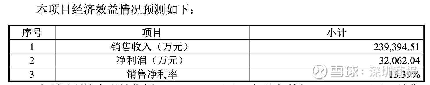 公告提到,该项目预计实现销售额23.94亿元,实现净利润3.21亿元,销售净利率为13.39%。