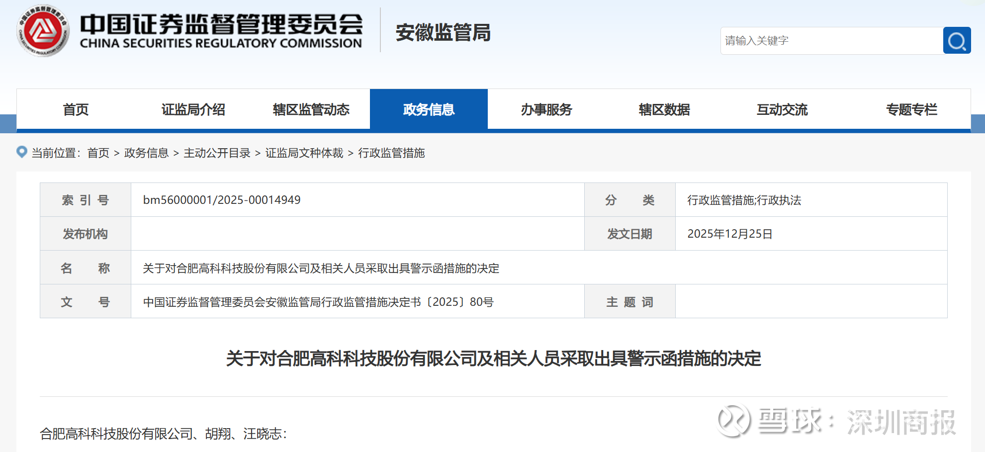 12月25日,安徽证监局网站发布《关于对合肥高科科技股份有限公司及相关人员采取出具警示函措施的决定》(下称《警示函》)。