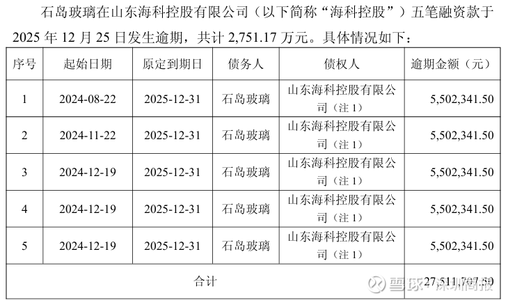 2025年8月,海科控股与石岛玻璃签署《债权展期协议》,将上述五笔借款展期到2025年12月31日;根据《债权展期协议》约定,若在中国国际经济贸易仲裁委员会进行仲裁的DC20250058号协议书争议案在2025年12月31日前作出仲裁裁决,则本协议项下的展期期限将截止至该仲裁裁决生效后的第15日即2025年12月25日。