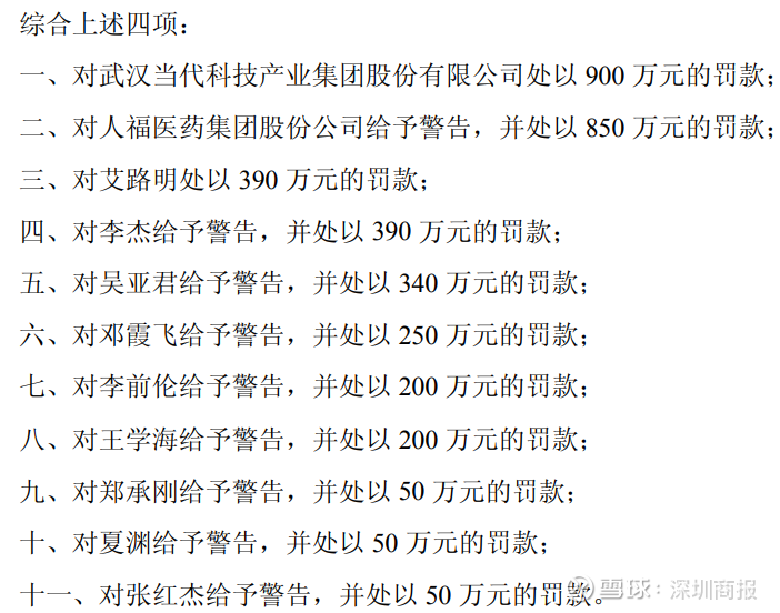 湖北证监局决定,对武汉当代科技产业集团股份有限公司处以900万元罚款,对人福医药集团股份公司给予警告并处以850万元罚款,对时任当代集团董事艾路明处以390万元罚款并采取七年市场禁入措施。时任ST人福董事长李杰、财务总监吴亚君分别被罚390万元、340万元,另有8名时任董监高分别被处以50万至250万元不等罚款。
