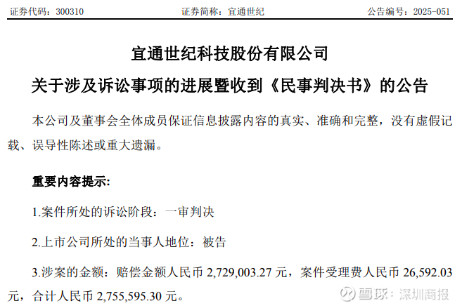 12月30日晚间,宜通世纪(300310)公告称,公司当日收到广东省广州市中级人民法院关于证券虚假陈述责任纠纷案的《民事判决书》。法院一审判决公司向原告陈*华、阮*良等109名投资者赔偿投资损失人民币2,729,003.27元,并承担案件受理费人民币26,592.03元,合计人民币2,755,595.30元。