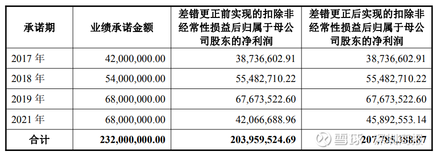 根据上述协议,李海建、达韦明合伙作为业绩补偿义务人承诺:嘉力达2017年、2018年、2019年、2021年经审计的扣除非经常性损益后的净利润分别不低于4,200万元、5,400万元、6,800万元、6,800万元。嘉力达在业绩承诺期任意一年度经审计扣除非经常性损益后的净利润数低于当年承诺净利润数95%时,则李海建、达韦明合伙当年须对公司进行补偿。如嘉力达在业绩承诺期经审计的实际净利润数达到当年承诺净利润数,则实际净利润数超出当年承诺净利润数的部分可延续计入以后年度业绩,但四年累计实际净利润合计不低于23,200万元。本次前期会计差错更正及追溯调整将对嘉力达业绩承诺期完成情况产生影响,具体如下:
