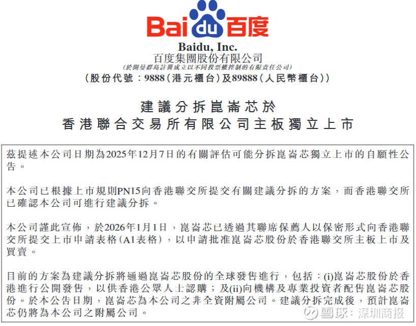 目前的方案为建议分拆将通过昆仑芯股份的全球发售进行,包括:昆仑芯股份于香港进行公开发售,以供香港公众人士认购;及向机构及专业投资者配售昆仑芯股份。于本公告日期,昆仑芯为本公司之非全资附属公司。建议分拆完成后,预计昆仑芯仍将为本公司之附属公司。