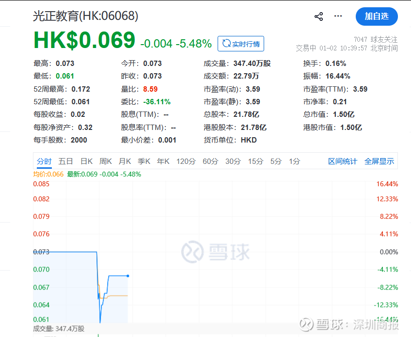 1月2日,港股2026年首个交易日,光正教育(代码:06068)开盘即跳水,跌幅一度超过16%,此后逐步反弹,跌幅缩窄至5.48%左右,成交极度萎靡。