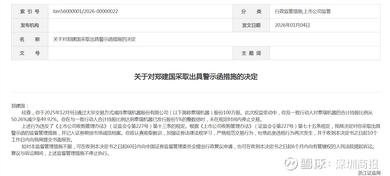 浙江证监局指出,经查,郑建国于2025年12月9日通过大宗交易减持泰瑞机器股份100万股。此次权益变动导致其与一致行动人对泰瑞机器的合计持股比例从50.26%下降至49.92%。当合计持股比例达到公司已发行股份5%的整数倍时,郑建国未按规定停止交易。上述行为违反了《上市公司收购管理办法》第十三条的规定。依据该办法第七十五条,浙江证监局决定对郑建国采取出具警示函的监督管理措施,并将此记录记入证券期货市场诚信档案。