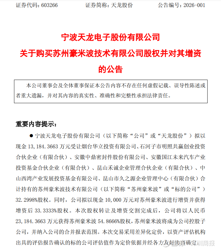 1月4日晚间,天龙股份(603266)公告,公司拟以受让股权及增资形式对苏州豪米波技术有限公司(简称“苏州豪米波”)进行投资。本次股权转让及增资交割完成后,公司将以2.32亿元现金获得苏州豪米波54.8666%股权,苏州豪米波将成为公司控股子公司,并纳入公司的合并报表范围。