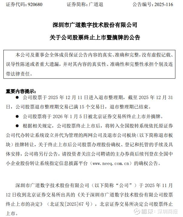 2026年1月5日晚,北交所上市公司深圳市广道数字技术股份有限公司(以下简称广道数字或广道退,代码920680)发布公告,公司股票被北交所终止上市并摘牌。广道数字由此创下两个“纪录”:新年首只退市个股,以及北交所设立以来首例因重大违法被强制退市的案例。