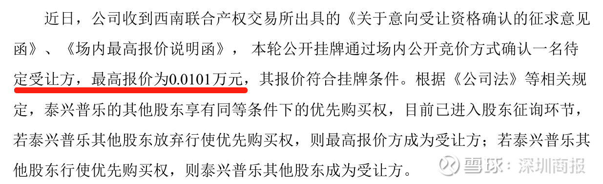 最终,第六次挂牌底价降至1元,目前已确认一名待定受让方,最高报价为101元,正在进行股东征询环节,若其他股东放弃优先购买权,则该报价方将成为受让方。