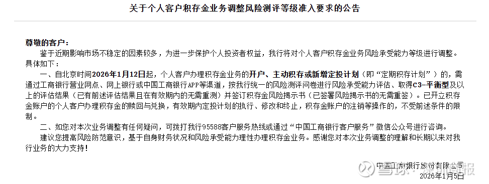 工商银行发布的《关于个人客户积存金业务调整风险测评等级准入要求的公告》显示,“自2026年1月12日起,个人客户办理积存金业务的开户、主动积存或新增定投计划(即‘定期积存计划’)的,需通过工商银行营业网点、网上银行或中国工商银行APP等渠道,按我行统一的风险测评问卷进行风险承受能力评估、取得C3-平衡型及以上的评估结果(已有前述评估结果且在有效期内的无需重测)并签订积存金风险揭示书(已签署风险揭示书的无需重签)。已开立积存金账户的个人客户办理积存金的赎回与兑换,有效期内定投计划的执行、修改和终止,积存金账户的注销等操作的,不受前述条件的限制。”