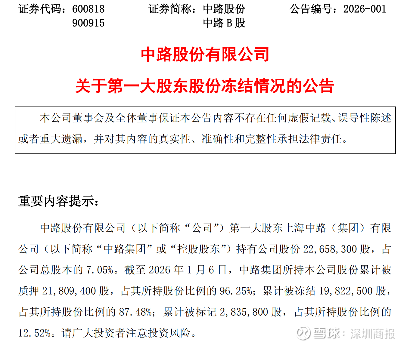 1月7日晚间,中路股份(600818)公告,第一大股东中路集团股份遭冻结调整。