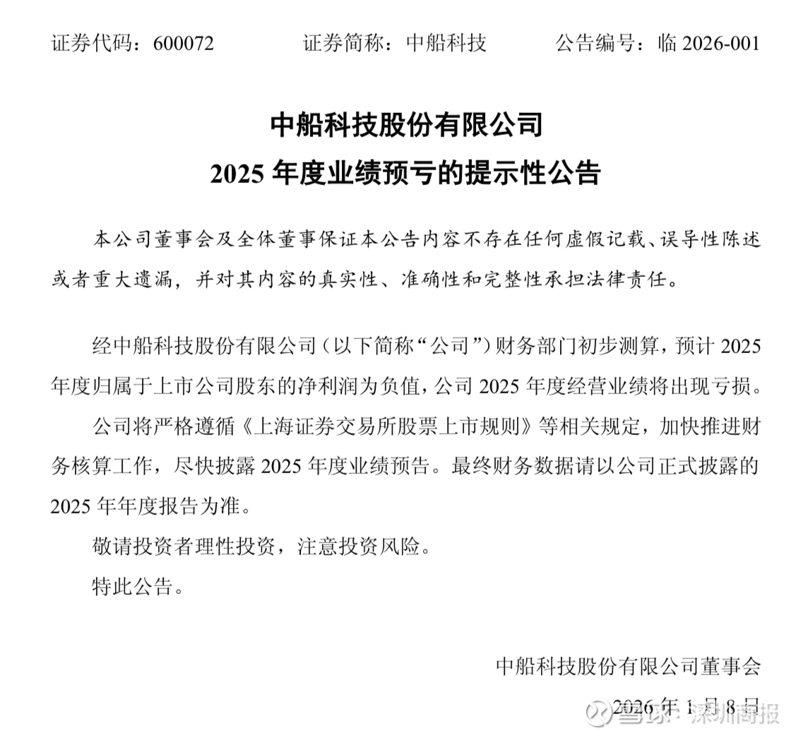 1月7日,中船科技(600072)发布公告,公司预计2025年度归母净利润为负值,公司2025年度经营业绩将出现亏损。