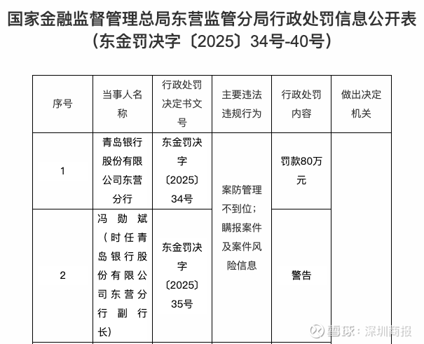 1月7日,国家金融监督管理总局东营监管分局行政处罚信息公开表显示,青岛银行股份有限公司东营分行因案防管理不到位、瞒报案件及案件风险信息,被处罚款80万元;时任青岛银行股份有限公司东营分行副行长冯勋斌被警告。