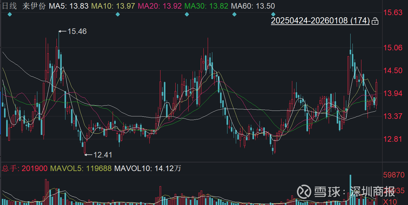 二级市场上,截至1月8日收盘,来伊份上涨4.11%报14.20元/股,总市值约47.49亿元,近一年公司股价近乎“原地踏步”。
