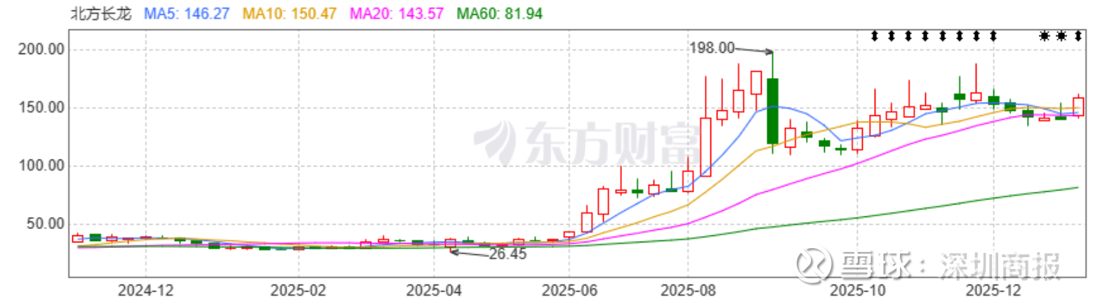二级市场上,2025年,北方长龙股价累计上涨324.07%。截至1月9日发稿时间,北方长龙股价涨7.47%报158.88元/股,公司总市值151.3亿元。