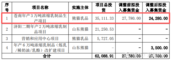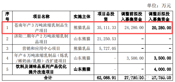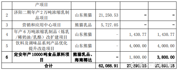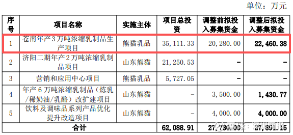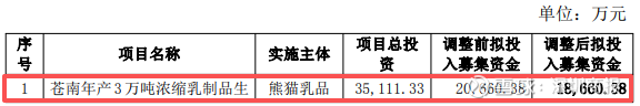 直到去年年底,熊猫乳品召开会议,同意公司调整募投项目“定安年产5000吨食品原料项目”投资规模、扩大产能,将“定安年产5000吨食品原料项目”名称变更为“定安年产10000吨食品原料项目”,其中涉及变更部分募集资金用途,将原拟投入苍南项目中的2,000万元募集资金转投于“定安年产10000吨食品原料项目”,向该募投项目实施主体之一的全资子公司海南椰达增资2,000万元,对该募投项目追加投资。