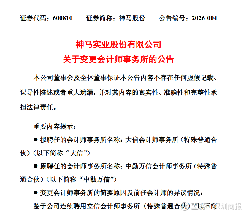 然而,中勤万信近期因“2025年度审计任务繁重、人员调整、其他项目时间安排变动等因素”,预计无法如期完成神马股份2025年度财务报告与内部控制审计任务。经沟通,中勤万信对此变更无异议,并将按规定做好前后任会计师事务所的沟通配合工作。