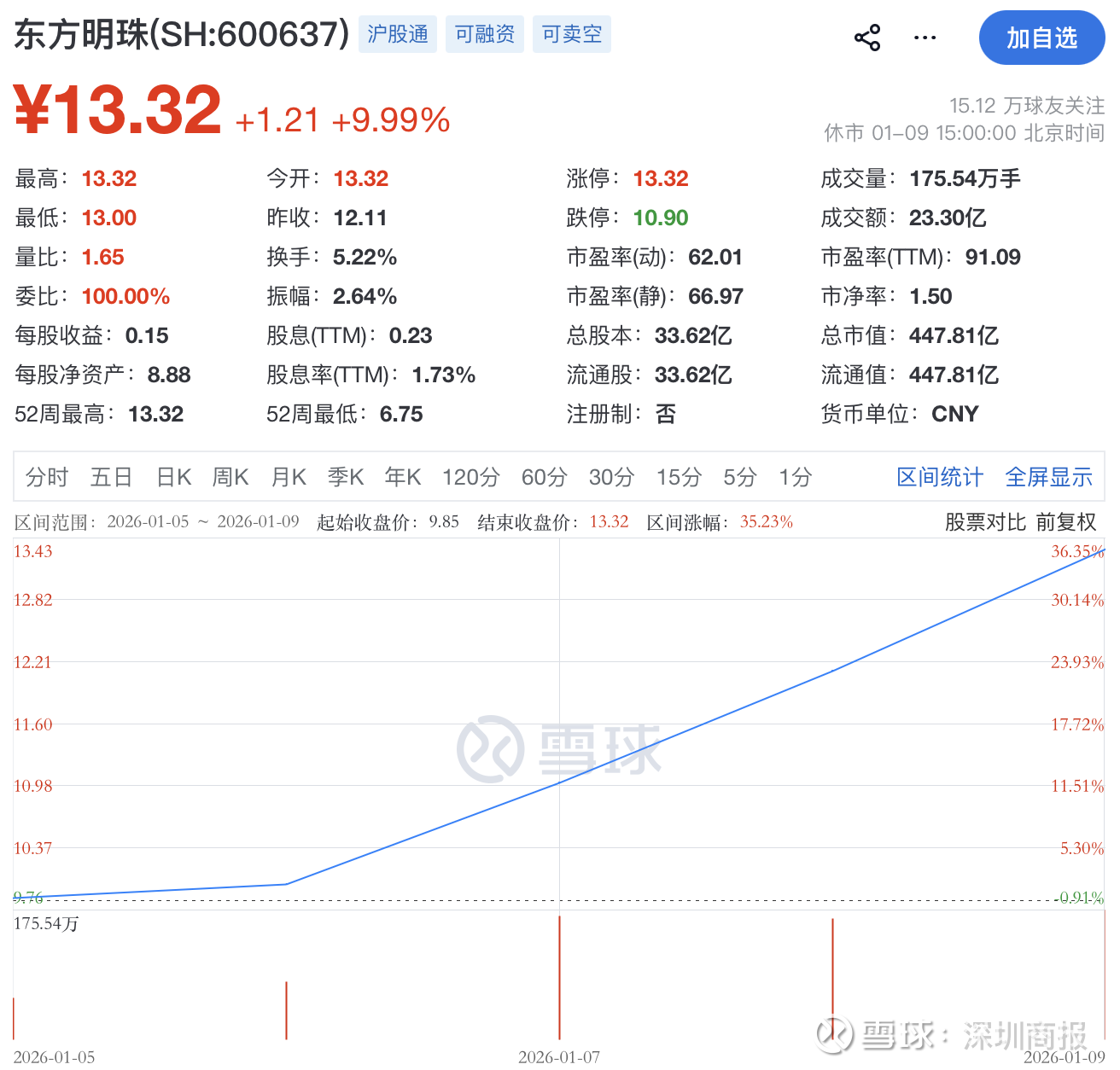 据公司1月9日发布的《股票交易风险提示性公告》,其股价已在1月7日至9日连续三日上涨,触发交易异常波动。截至1月9日收盘,公司股价收于13.32元/股,总市值447.81亿元。
