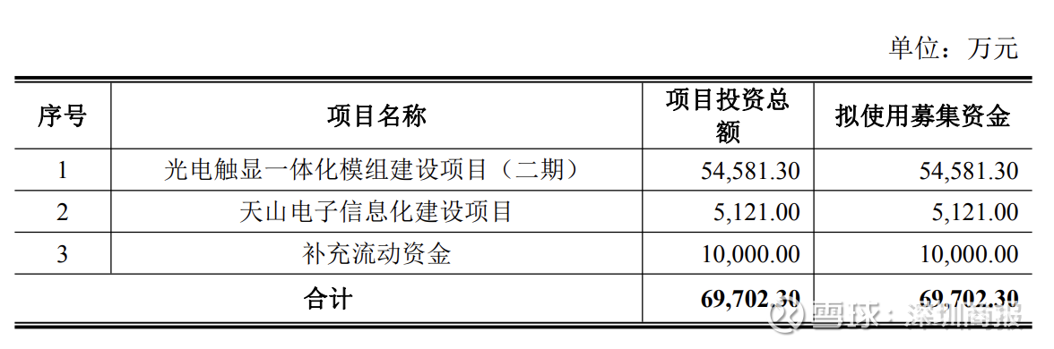 根据预案修订稿,天山电子拟募集资金总额不超过6.97亿元(含本数),扣除发行费用后,募集资金净额拟用于光电触显一体化模组建设项目(二期)、天山电子信息化建设项目、补充流动资金。其中,拟使用募集资金1亿元用于补流。