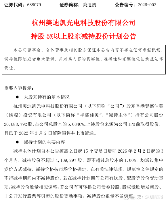 1月11日,美迪凯(688079)发布公告,股东香港豐盛佳美(國際)投資有限公司(以下简称“丰盛佳美”)因自身资金需求,计划自2026年2月2日起的3个月内,通过集中竞价方式减持不超过410.93万股公司股份,占公司总股本的1%。