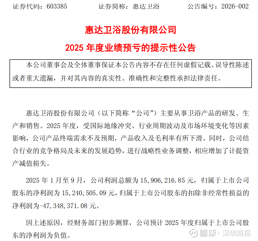 1月12日晚间,惠达卫浴(603385)发布2025年度业绩预亏的提示性公告。经财务部门初步测算,公司预计2025年度归属于上市公司股东的净利润为负值。
