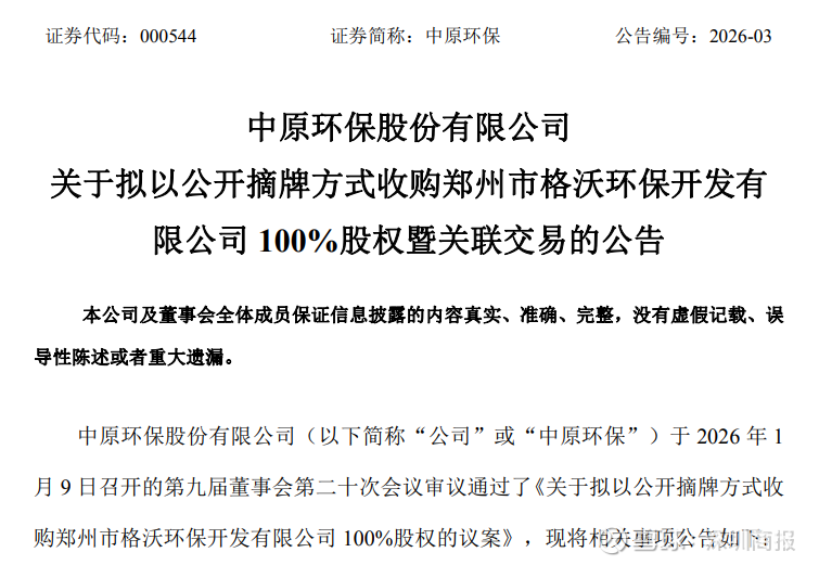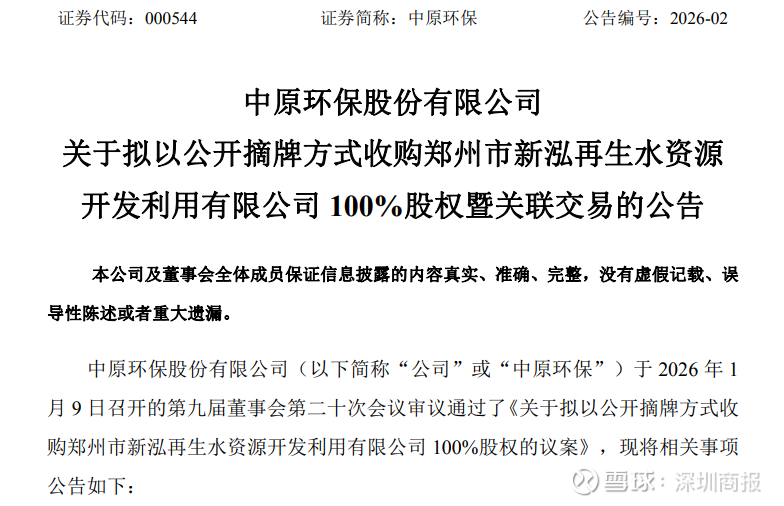 1月13日,中原环保(000544)公告,公司拟通过公开摘牌方式收购郑州市新泓再生水资源开发利用有限公司(简称“新泓公司”)100%股权,挂牌价格1.46亿元。此外,公司公告拟通过公开摘牌方式收购郑州市格沃环保开发有限公司(简称“格沃公司”)100%股权,挂牌价格1.33亿元。上述交易对象为公司间接控股股东。