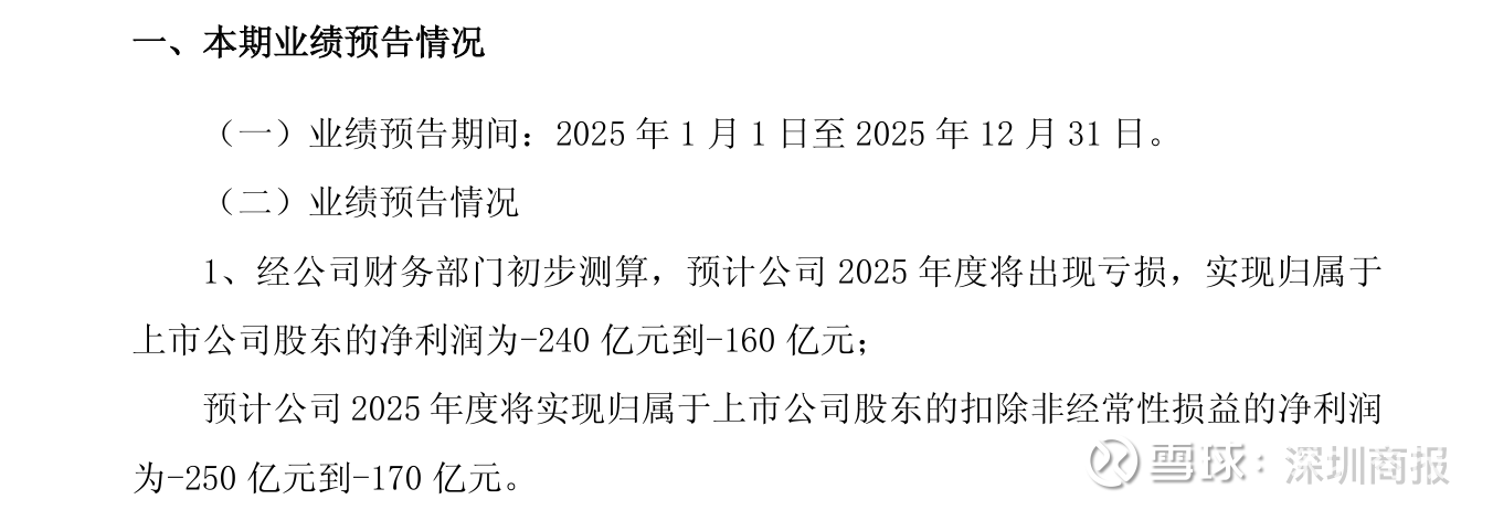 经公司财务部门初步测算,预计公司2025年末归属于上市公司股东的净资产为-150亿元到-100亿元。若公司2025年末归属于上市公司股东的净资产为负值,公司股票在2025年年度报告披露后可能被实施退市风险警示。