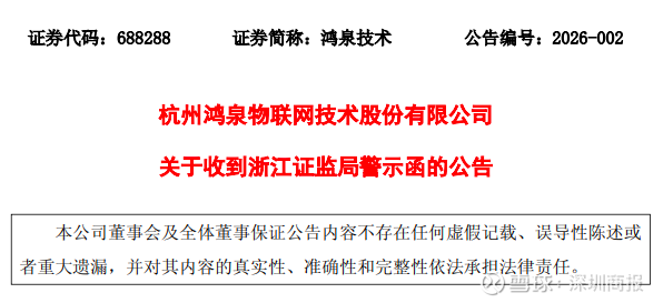 1月15日,鸿泉技术(688288)公告称,公司涉资金占用、内控不规范等多重问题收到浙江证监局警示函,同时上交所对公司及相关责任人予以监管警示。