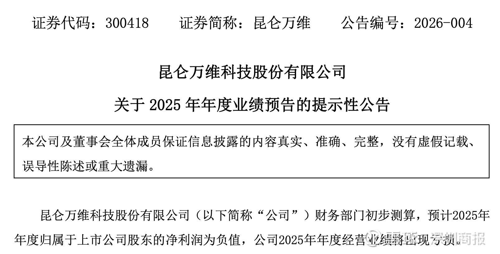 1月15日,昆仑万维(300418)公告,公司财务部门初步测算,预计2025年度归属于上市公司股东的净利润为负值,公司2025年度经营业绩将出现亏损,具体金额暂未透露。