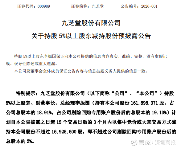 1月15日,九芝堂(000989)公告,公司持股5%以上的股东、副董事长、总经理李振国计划15个交易日后的3个月内,以集中竞价或大宗交易方式减持公司股份不超过1692.56万股,即不超过公司剔除回购专用账户股份后总股本的2%。