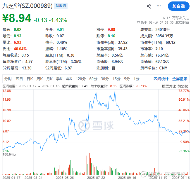 二级市场上,截至发稿,九芝堂下跌1.43%报8.94元/股,总市值76.61亿元。