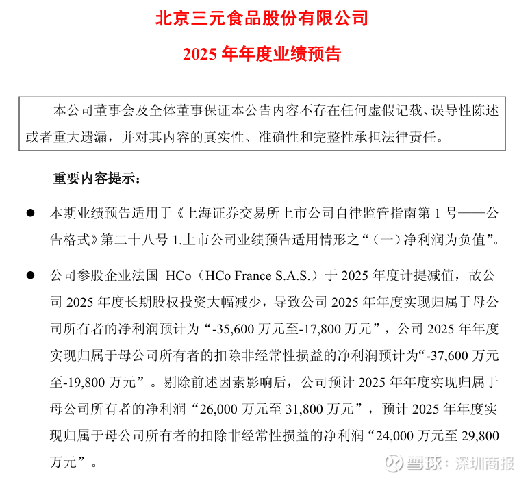 1月16日,三元股份(600429)发布公告,公司参股企业法国HCo(HCo France S.A.S.)于2025年度计提减值,故公司2025年度长期股权投资大幅减少,预计2025年归属母公司所有者的净利润亏损1.78亿元至3.56亿元。