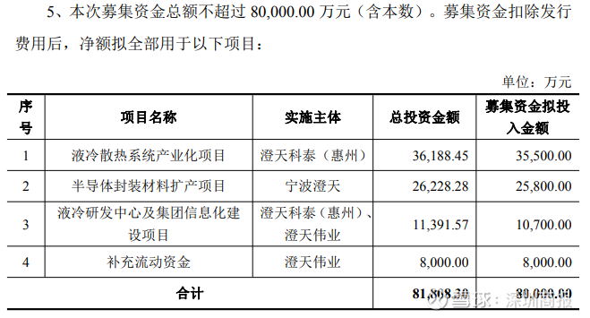 预案显示,公司拟以竞价方式向不超过35名合格投资者发行股份,募集不超过8亿元,投向液冷散热、半导体封装材料等“硬科技”赛道,并同步补充流动资金。