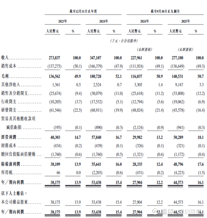 业绩方面,睿云联实现了强劲的财务表现。收入由2023年的人民币273.8百万元增长26.8%至2024年的347.1百万元,并由截至2024年9月30日止九个月的228.0百万元增长21.6%至2025年同期的277.2百万元。利润由2023年的38.2百万元增加40.0%至2024年的53.4百万元,并由截至2024年9月30日止九个月的27.9百万元增加59.7%至2025年同期的44.6百万元。