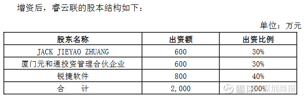 2014年10月,星网锐捷公告,公司全资子公司锐捷软件拟与JACK JIEYAO ZHUANG、厦门元和通投资管理合伙企业共同增资睿云联(厦门)网络通讯技术有限公司。其中:锐捷软件以现金方式出资800万元,占睿云联注册资本40%;JACK JIEYAO ZHUANG、厦门元和通投资管理合伙企业以现金方式增资400万元,增资后分别占睿云联注册资本30%。该事项议案经公司董事会通过。