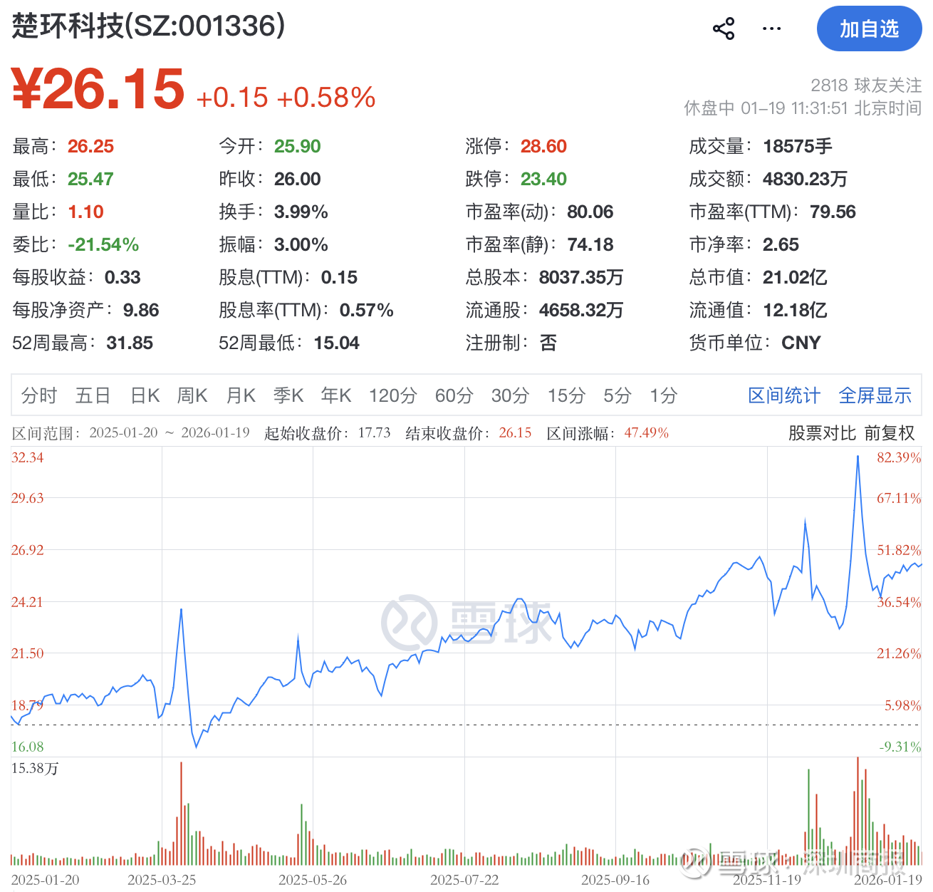 二级市场上,截至1月19日午间休盘,楚环科技上涨0.58%报26.15元/股,最新市值21.02亿元。