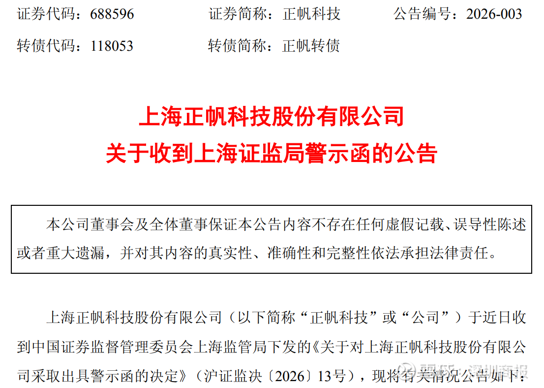 1月19日晚间,正帆科技(688596)公告,公司于近日收到中国证券监督管理委员会上海监管局下发的《关于对上海正帆科技股份有限公司采取出具警示函的决定》。《警示函》指出,公司存在总经理会议运作不规范、投资管理不规范问题。