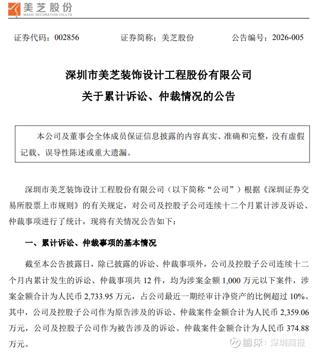 1月22日,美芝股份(002856)发布《关于累计诉讼、仲裁情况的公告》,披露公司及控股子公司近十二个月内累计涉及诉讼、仲裁案件共12件,涉案金额合计2733.95万元。