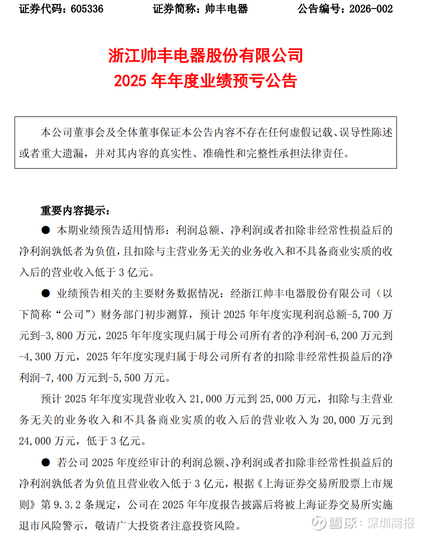 帅丰电器(605336)1月23日晚间公告,预计2025年实现归属于母公司所有者的净利润亏损4300万元至6200万元,预计2025年实现营业收入2.1亿元至2.5亿元,扣除与主营业务无关的业务收入和不具备商业实质的收入后的营业收入为2亿元到2.4亿元,低于3亿元。公司股票在2025年年度报告披露后可能被实施退市风险警示(在公司股票简称前冠以“*ST”字样)。