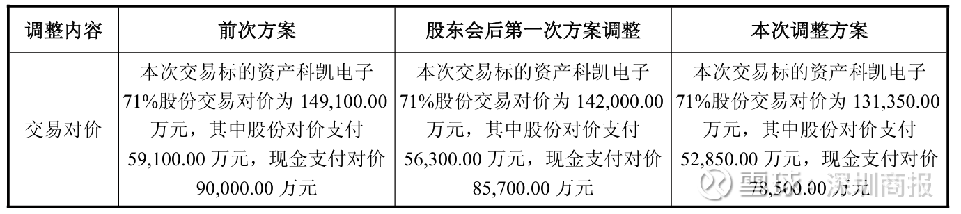 记者注意到,思林杰期间多次下调标的交易对价。2025年5月,科凯电子71%股份的交易对价被调整为14.2亿元;同年10月,该股份的交易对价进一步下调至13.14亿元。